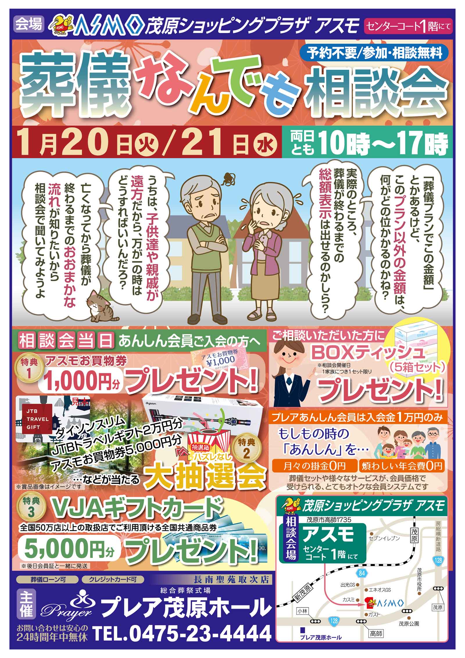 1月20日(火)、21日(水)の二日間、茂原ショッピングプラザアスモ【センターコート1階】にて葬儀なんでも相談会を行います。