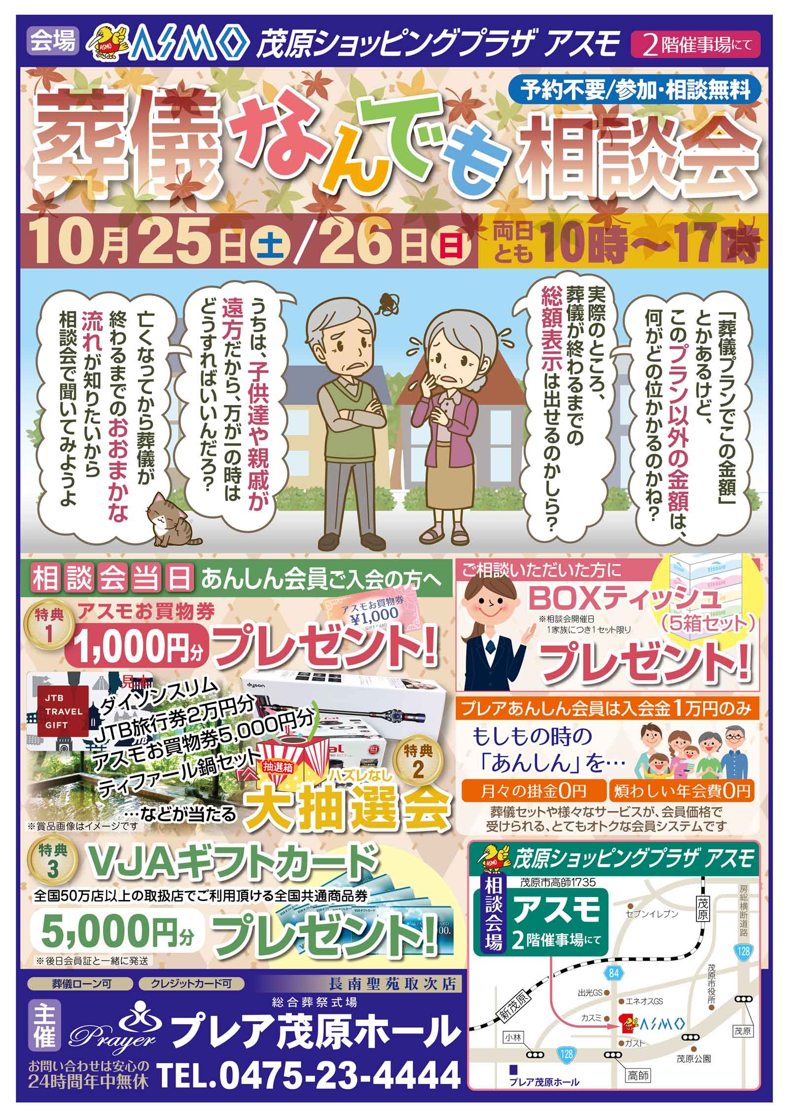 10月25日(土)、26日(日)の二日間、茂原ショッピングプラザアスモ2階催事場にて葬儀なんでも相談会を行います。