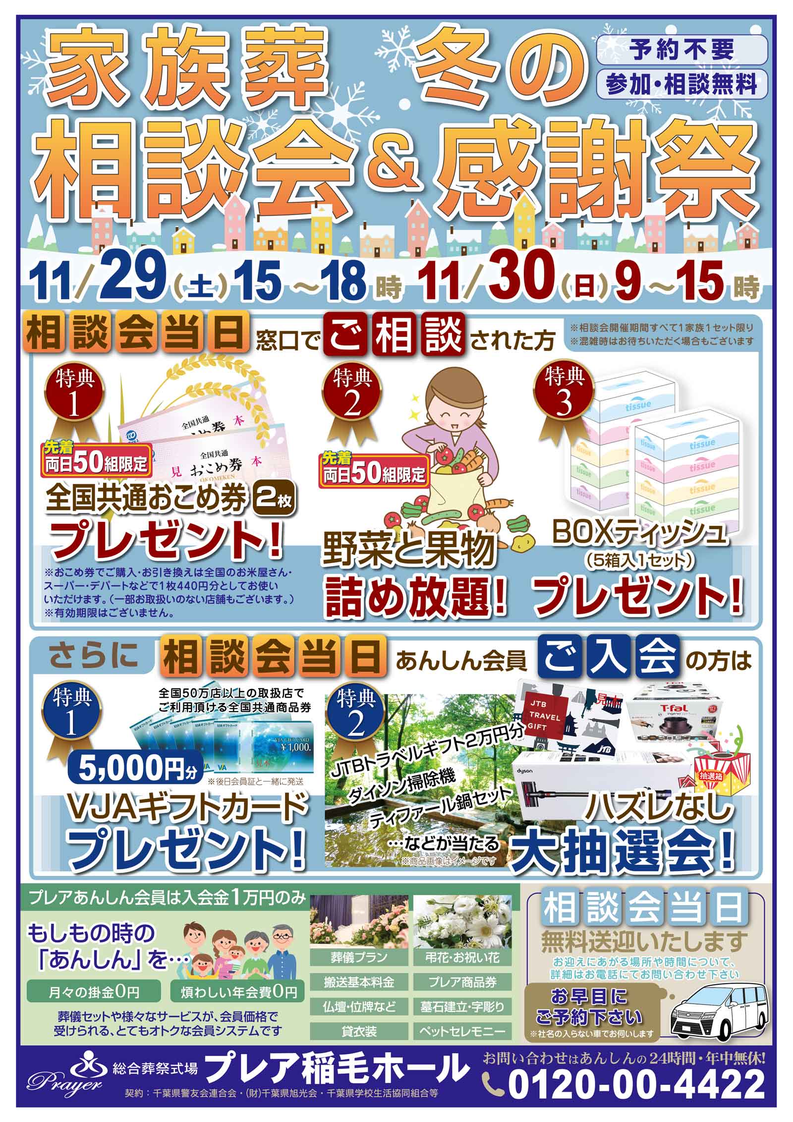 11月29日(土)、30日(日)の二日間、プレア稲毛ホールにて家族葬相談会&冬の感謝祭を開催します。