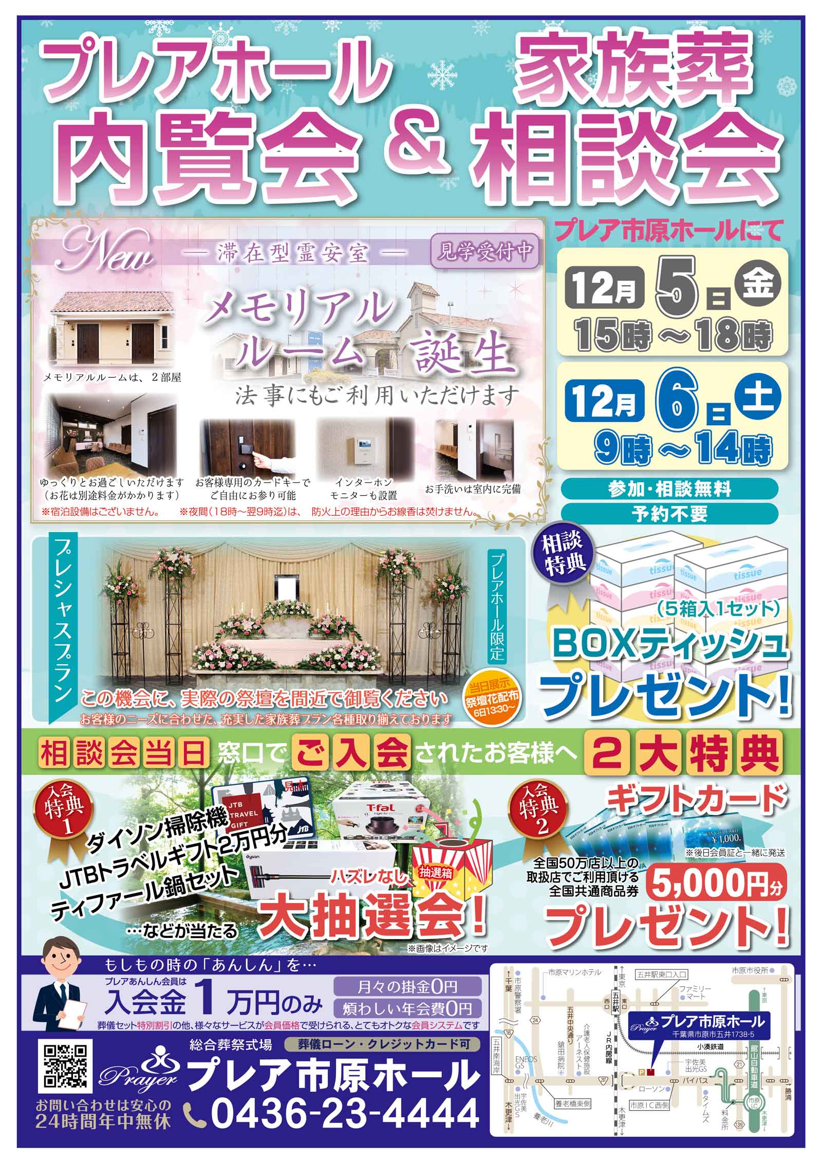 12月5日(金)、6日(土)の二日間、プレア市原ホールにてプレアホール内覧会&家族葬相談会を行います。